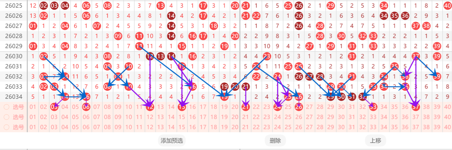 第二:判断第一区间热度会有所上升,注意一些奇数偶数搭配的联动号码,需关注斜连形态的号码。