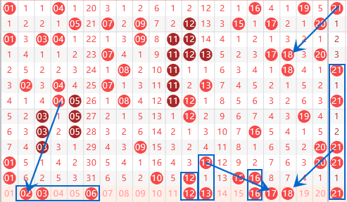 该区间的01号数字走重了,本期我们要注意一下02号数字的出号情况。03号数字是属于重号回补,又是242的走势,可以关注一下。最大冷号06号本期做防守就行了,不用过多的关注。本期的13号数字是属于141走势,可以关注一下。连号15 16号数字我们要注意一下出重的情况。本期的18号数字也是可以关注一下的,属于遗漏7期的号码有两个,出一个的机会还是有的。