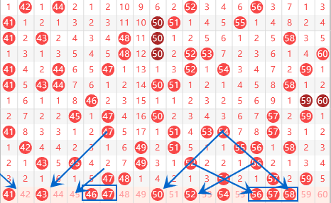 本期的46号数字可以做一下防守,近3期内应该会开出来。注意本期的50号数字,50 52 54斜连是很容易开出来的。本期的的56 57 58我们可以关注一下出连号的情况。尤其是58号数字即使斜连5连又是232走势,出号机会还是大的。