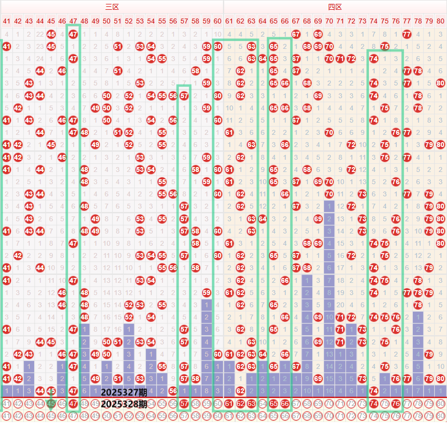 如图所示:在本期大数区的选号中注意在上期的走势中三区间开出了4枚中奖号码,本期注意在上期的开奖结果中,49的下方出现了断号走势,而是在44 45的位置开出了连号走势,本期注意44 45 47的位置下方出现重号走势,落号形态重点关注三角形态的走势,在尾部位置上期开出了56的延续走势,本期注意55 57的分边延续走势,四区间上期开出了两枚中奖号码落位在区间的最低位,本期注意四区间的落号数量出现大幅度的上涨走势,本期重点关注在62的位置下方开出分双边的走势,重点关注双码走势,或者是在62的下方直接考虑61 62 63的三连号走势,在上期开出74的位置下方注意74的重号,重点考虑72 74或者是74 76的偶数二连走势,区间重点关注区间同位走势。