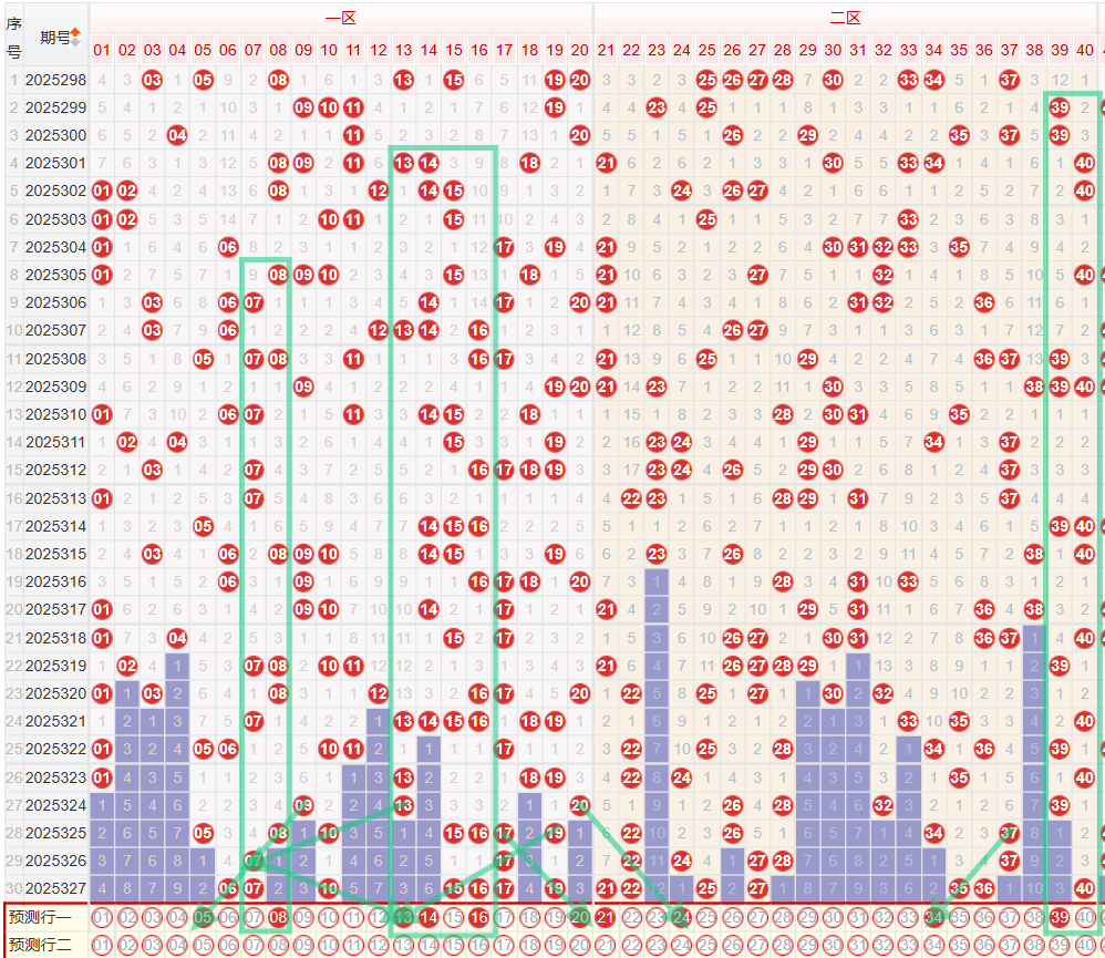 如图所示:在本期小数区的选号中,注意在上期的走势中一区间开出了7枚中奖号码,落位在区间同步最高位,在上期一区间开出了15 16 17的三连号走势,依旧还是保持着连号遗漏一期的走势15 16,本期要注意15 16的重号走势,以及在上期开出16 19 22 25的同路四码走势,本期如果考虑16的重号走势,则要注意13 16的同路向前走势,前段位置在上期开出06 07的二连走势下方考虑05 08的分双边同路双码走势,二区间上期同样也是开出了7枚中奖号码,落位在同步的最高位走势,本期注意在上期尾部位置开出40之后,要注意近期的40-39多次出现交替走势,本期重点考虑39号的延续走势,前段位置注意21 22向前或者是向后开出20 21或者是向后开出22 23的错位二连走势,中段位置注意观察,以防继续保持空位走势,在上期开出25的斜线第二期走势下方要注意24 25 26的位置继续保持号码的开出。