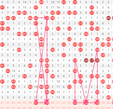 三区分析:【41-60】(走势图标注号码非小黄车大底,请谨慎参考,具体思路上期三区间开出了1个号码,区间突然大冷有一点意外,直播间说到它会楞,没想到会这么冷只出了60这一个号码,本期在3区的布局是空位温冷的选择,因为这个形态断了3期,本期预计会回补一码,还有就是空位小周期的出号预计2到3码,再有就是60这个孤码形态下方的布局。以上就是3区的区间布局思路大家参考。