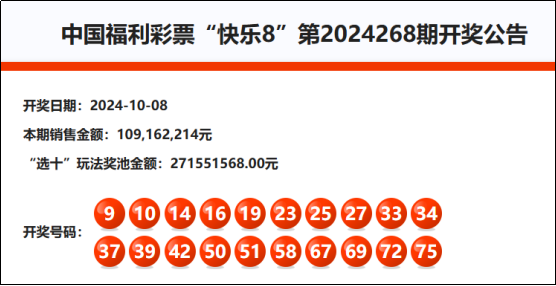 首先我们先来回顾快乐8第2024268期开奖号码: