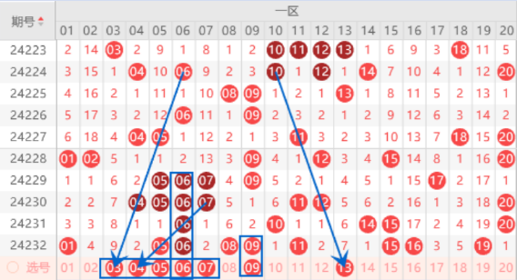上期该区间爆区了,开出了9个号码,本期的号码是要减少的,本期不能多做,尽量去做重号要好一点。上期开出了连号05 06号数字和连号08 09号数字,本期我们注意一下出重号的情况,重点关注一下05 09号数字出重的情况,本期的07 10号数字是属于夹号,本期也是要注意出一个号码的情况的,其中的07号数字是属于L型的对角号码,10号数字是属于梅花号码,最好是做防守就行了,定胆风险还是太大了。