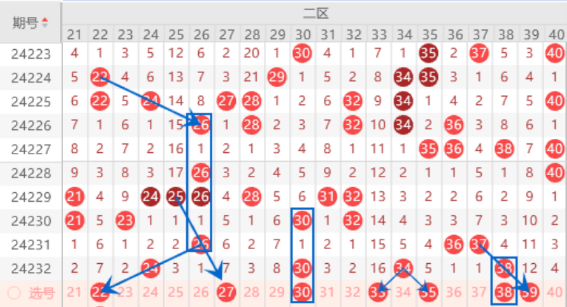 本期的22号数字我们注意一下出号情况,属于22 24 26号数字的三斜连号码,26号数字是属于空一对称号码,前面也是22 24 26号数字的斜连号码,刚好形成对应斜连号码,所以本期的22号数字我们可以重点关注一下。该区间上期开出了24 30 34 38号数字,本期我们注意出一个重号的情况,重点关注一下30 38号数字出重的情况,其中的30号数字我们要重点关注一下,属于复制号码,出号机会比较大的。