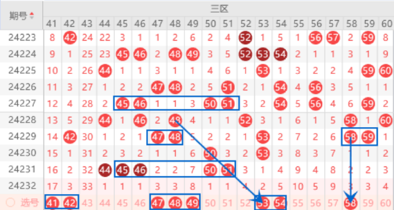 本期的47 48号数字是属于复制号码,上一次开出的45 56 50 51号数字的时候空一期开出了47 48号数字,那么本次的45 46 50 51号数字也是空一期了,所以本期的47 48号数字我们要注意出号情况,最好是做一个号码就行了,不要两个号码同时做号。本期的52 55 58号数字我们要注意出号情况,它们是属于2路号码,已经遗漏4期没有开出来了,本期出一个号码的情况是很大的,我们重点关注一下52 58号数字的出号情况,其中的58号数字是属于连号落号,出号机会要大一点。