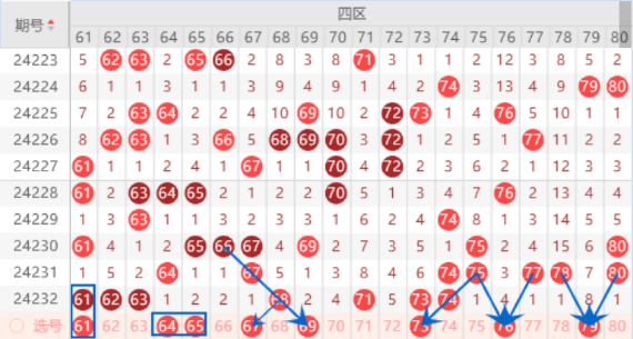 上期开出了三连号61 62 63号数字,根据该区间的三连号出号走势来看,本期的61 63号数字是有很大机会出一个重号的,如果63号数字出重了,那么本期的73号数字出重的机会就不会很大了,如果63号数字不出重,那么本期的61 73号数字我们就要注意同出的情况了。本期的76 79号数字我们要注意出一个号码的情况,都是属于夹号回补号码,76号数字是属于三斜连号码,出号机会比较大一点,我们可以关注一下。