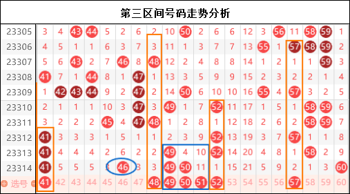 第三区间思路:三区连续两期在走势上主打重号和连号,眼看是主线继续回归的趋势,所以本期中我们继续追寻着这条路线前行,一定会在本期中捕捉到不错的号码,不过作为目前最冷的区间,三区能不能在本期崛起与其他区间一决雌雄,本期也是一个看点。不管如何布局,大家切记一点,三区主线连号的重号一期冲击,必定会有不错的收获。