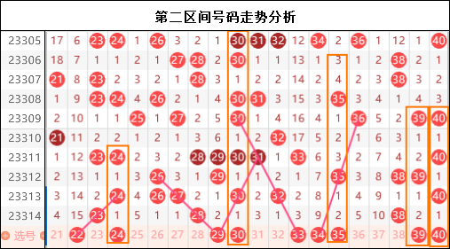 第二区间思路:二区本期看起来有点爆区的意思,号码的走势在全局简直是密密麻麻。结合一区的走势来看,还真是有点可能。如果本期区间不做继续回调,本期二区应该是重点关注区间。不过与一区不同的是走势过于明显,落位太直接,几乎全都是明码布局,这显然是有风险的。