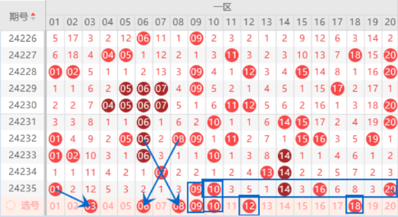 上期该区间开出了01 09 10号数字,本期我们注意一下出一个重号的情况,重点关注一下09 10号数字的连号出重的情况,本期的09 10号数字都有重的机会,不好选择,如果本期的10号数字出重了,那么本期的08号数字出号机会就不会很大,我们要注意一下。本期的12 18号数字都是空三中心号,本期我们注意一下出一个号码的情况,本期的18号数字是属于遗漏8期的号码,本期遗漏8期的号码有两个,本期不一定会出号,所以本期的12号数字我们可以关注一下。