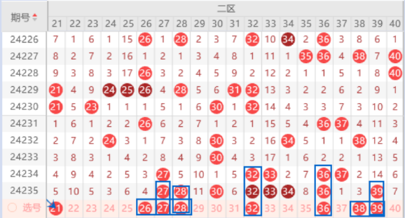 本期的21 22 23 24号数字我们要注意出号情况了,同时断号3期了,本期的23 24号数字我们注意出一个号码的情况,其中的24号数字可以重点关注一下。上期开出了连号空一带号27 28 30 32 33 34 36号数字,本期这里是要出重号的,重点关注该区间的三重号出号情况就行了,重点关注一下27 32号数字出现3重号的情况,本期32号数字是属于三连号的三重号,出号机会比较大一点,可以重点关注一下。