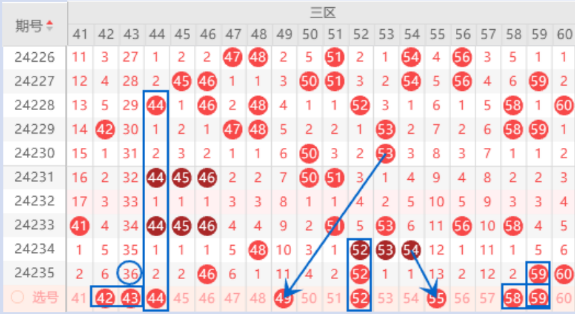 本期的43号数字是属于遗漏36期的号码,已经是历史最大遗漏期数了,本期我们可以小做一下,本期很有可能会开出来了,这里我们可以防守一下42 43 44号数字同出的情况。上期开出了连号59 60号数字,本期我们注意一下出重号的情况,其中的59号数字可以重点关注一下出号情况,上期开出了10 20 30 60号数字,本期要重应该也是在10 20 30号数字里出重,所以本期的60出重的机会不是很大。