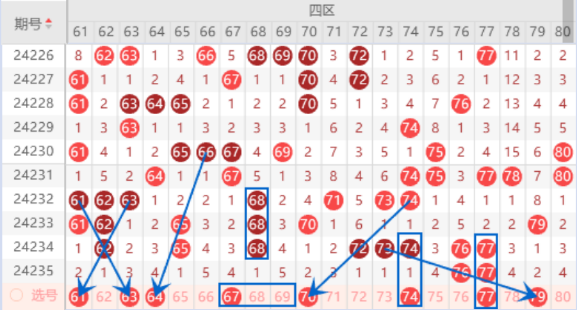 上期的6字头断号了,本期的61 62 63 67 68 69号数字都是属于重号边号回补号码,本期是要有号码回补下来的,我们重点关注一下61 63 67号数字的出号情况就行了,这里由于有两组边号回补,应该是有一组是要断号的,我们要注意一下。上期的三连号72 73 74号数字没能开出了重号来,本期我们注意回补一个号码的情况,其中的74号数字我们可以重点关注一下出号情况。