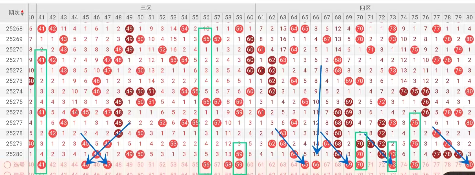 四区间上期开出64-68-70-72-73-77-78-79, 共8个号码,本期大家可以根据尾数、隔期码、以及边码走势情况,本期首先需看69相邻码、70会再出现;上期64-68区间未开出号,本期出号65机会比较大,本期四区有连续号69-70预测会出,上期龙头64,凤尾79,本期预测龙头65、凤尾80,本四区间建议大家关注号码69会出,再根据号码走势预防连续号69-70出现。综合分析筛选,本期四区推荐:65-66-69-70-73-80