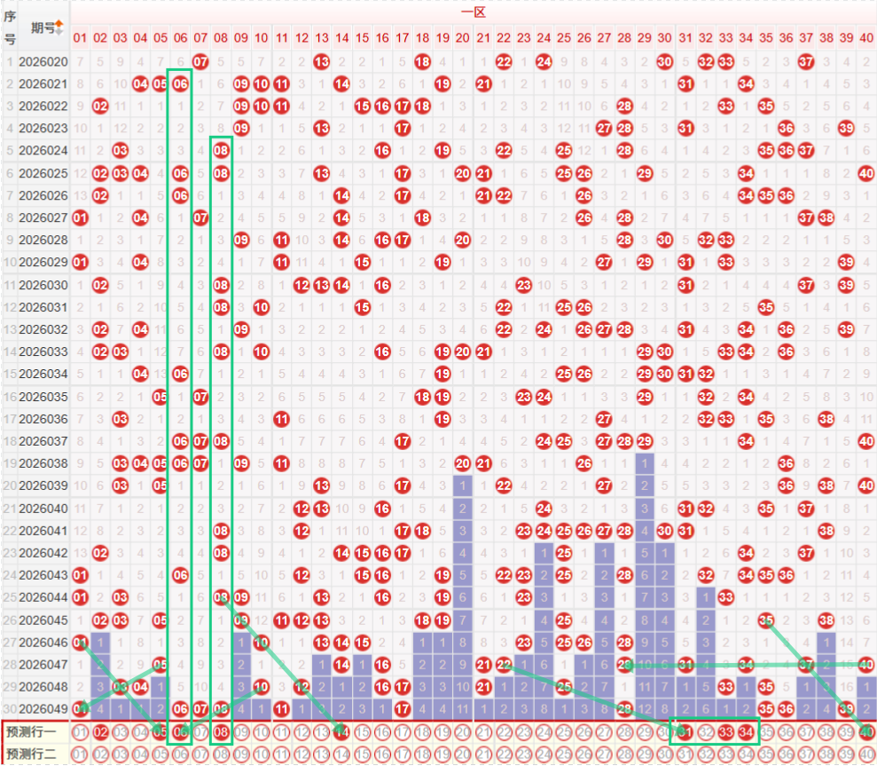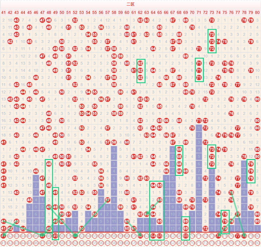 如图所示:在本期大数区的选号中注意在上期的走势中三区间开出了6枚中奖号码,落位在区间最高位走势,出现了双冷的回补走势,落号分布较为分散,本期注意上期开出48之后,依旧保持着较为强势的连续走势,本期注意48的下方继续保持着分边走势,可考虑47 49的双边走势,以及在上期开出53的位置继续做延续走势,龙头位置注意41的重号三期走势,四区间上期开出了4枚中奖号码,开出了重号75的三期走势,本期注意69的重号第三期走势,以及64 65的斜线下方出现回补走势,可考虑二连走势,在上期开出75的重号三期走势后方本期注意连号的回补走势,个人较为看好77 78的冷二连回补走势。