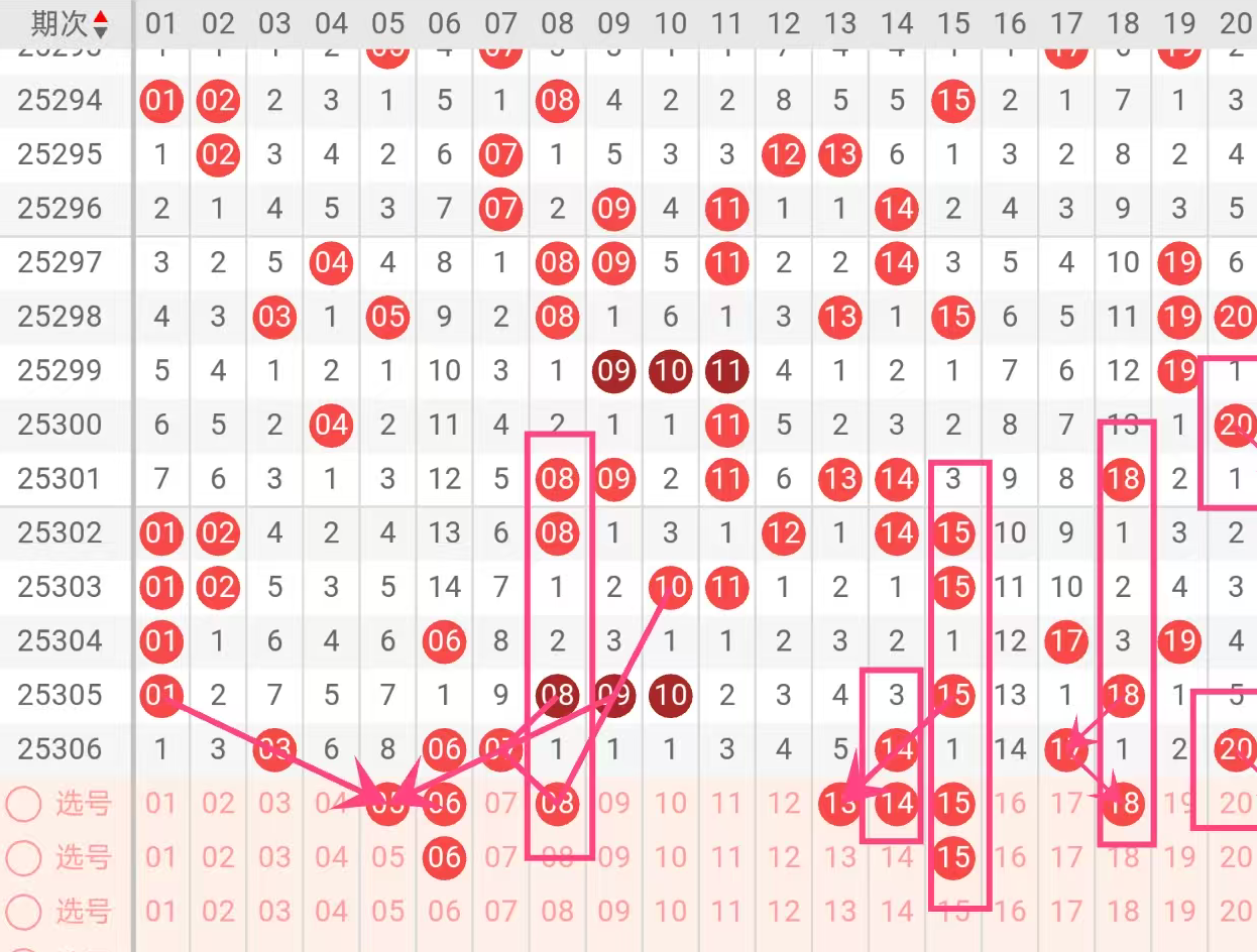 08(302期、305期开出):一区“10-20段”热号。节奏呈"302期开出→303-304期休整→305期回补→306期休整"的波动模型,展现出明显的阶段性活跃特征,该号与相邻温号07形成热温联动态势,此种区域号码的协同效应通常能有效提升其续出概率。