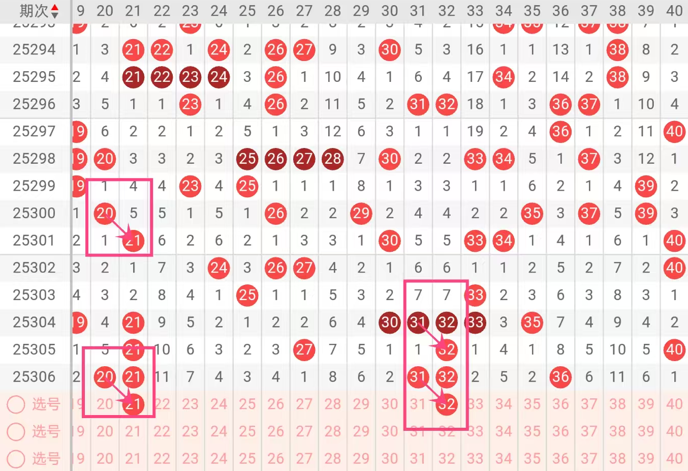 32(304期、305期、306期开出):二区“20-40段”热号。节奏呈与21号完全同步的三期连开模型。两号自304期起形成紧密联动,同期开出且节奏一致,又可借助31(热号)的下落态势继续增强其下落惯性,续出概率显著提升。