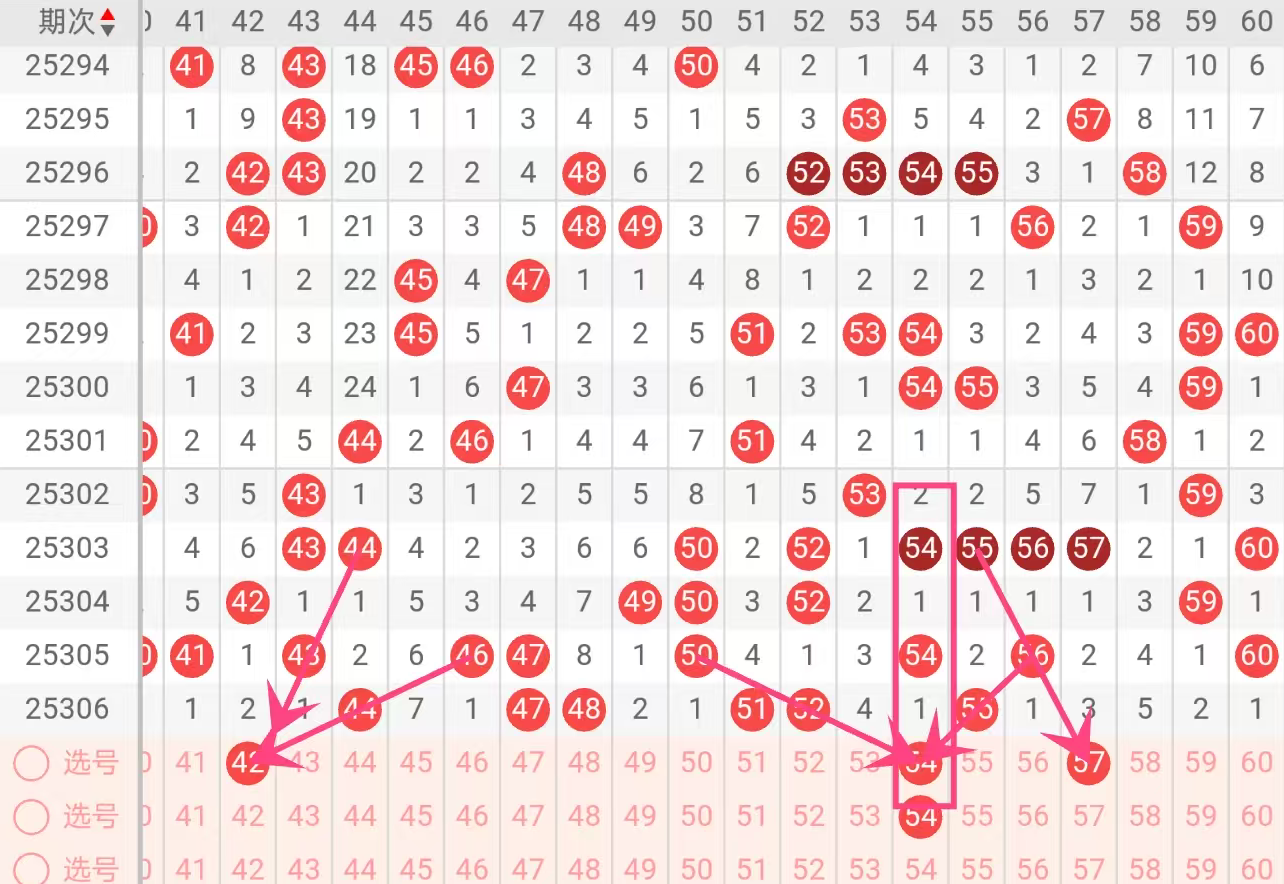 57(303期开出):三区“41-60段”温号。节奏呈"303期开出→304-306期连续休整三期"的长休整模型。回补需求迫切,且与热号54同处三区相邻位置,具备明显的联动条件。长休整后的回补概率提升。