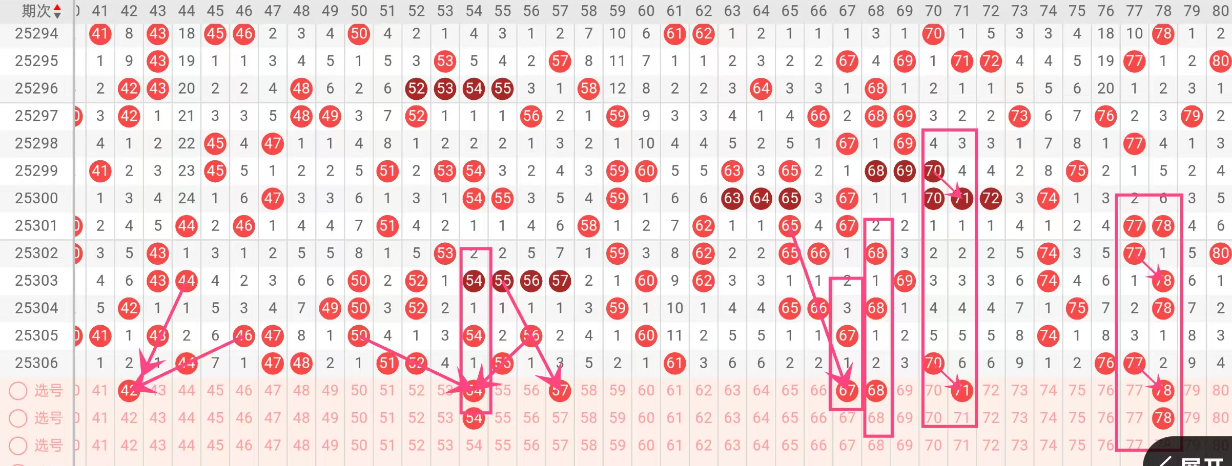 71(连续遗漏≥5期):四区“61-80段”冷号。该号紧邻近期活跃号70(306期开出)、74(305期开出),处于四区热号辐射带的核心位置,为冷号破冰创造了有利的条件。