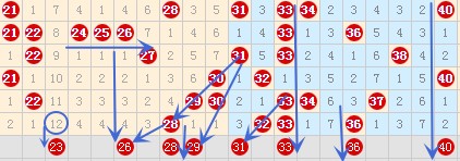 上期文章中就说过5 23号这两个同期遗漏值冷号出号情况,既然上期没开出来,那么本期我们就可以在它们之中定一胆码了。24 25 26号这个四连号已经同时遗漏四期了,本期可以防守它落号下来。28 29 30 31号已经是4斜连了,所以本期的27号数字应该出不来的,那么我们就可以从它的邻号26 28号数字作防了。上期开出的32 33号这个连号本期可以防守一下它的落号情况。40号数字形成了空二对称类型,也可以关注一下。
