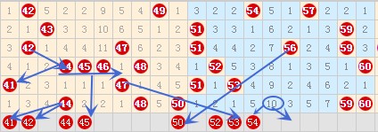 41 42号数字都是和44号数字关系很好的,既然上期开出了44号数字,那么本期的41 42号数字可以防守一下的。44 45 46号这个三连号上期落了44号数字,那么本期有待继续落号的,可以在45 46号数字中选一作防的。在50号到59号数字之间同期遗漏值的有两组为51 52号和54 57号,本期这些数字中应该也是有号码要开出的,本期的55号数字属于遗漏10期的冷号,而且本期遗漏10期的只有这一个号码,所以本期的55号数字是很难开出来的,我们就看它的邻号出号情况,所以这里比较看54号数字的。