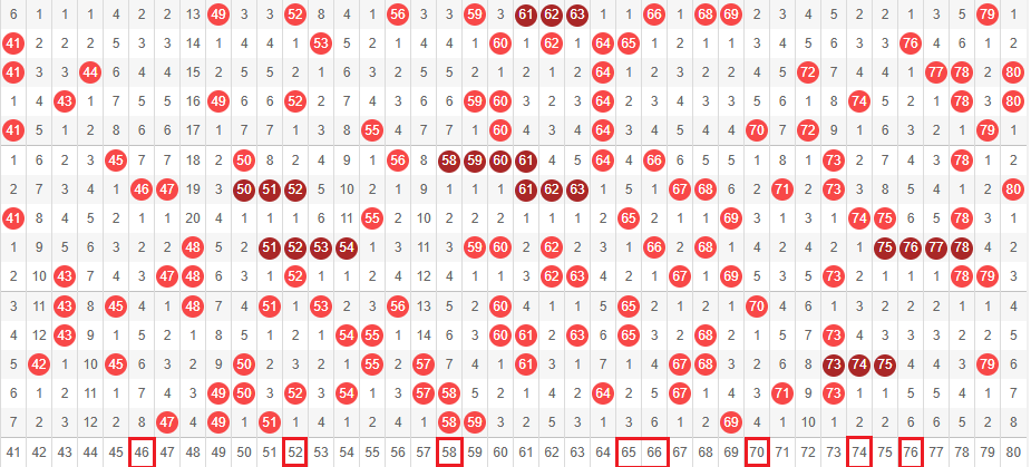 接下来我们一起看走势图,我们把01-40分为前区,41-80分为后区。