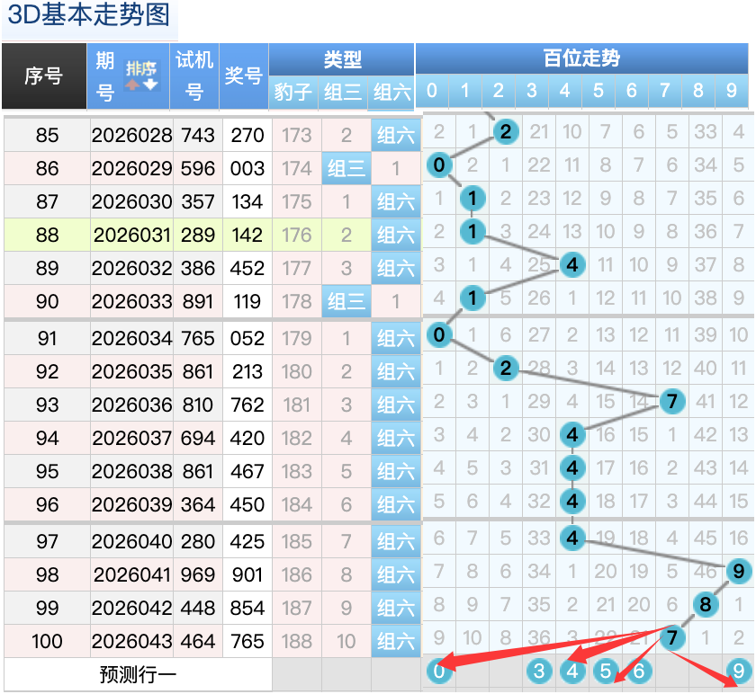 3D上期百位开出的7球,这个奖号7是一个冷码回补落位趋势也是一个比较好的符合百位上的落位点,先来看0号球这里还是有机会继续走出一个小号码落位的小周期回补趋势,还有一个就是3号球这里的是一个大冷号的落位形态的概率在这里的机会还是很好的要注意防守,然后6号球这里要注意是一个顺位码回补落位趋势注意防守,9号球在百位上要注意可能有机会走折返的落位注意防守 。