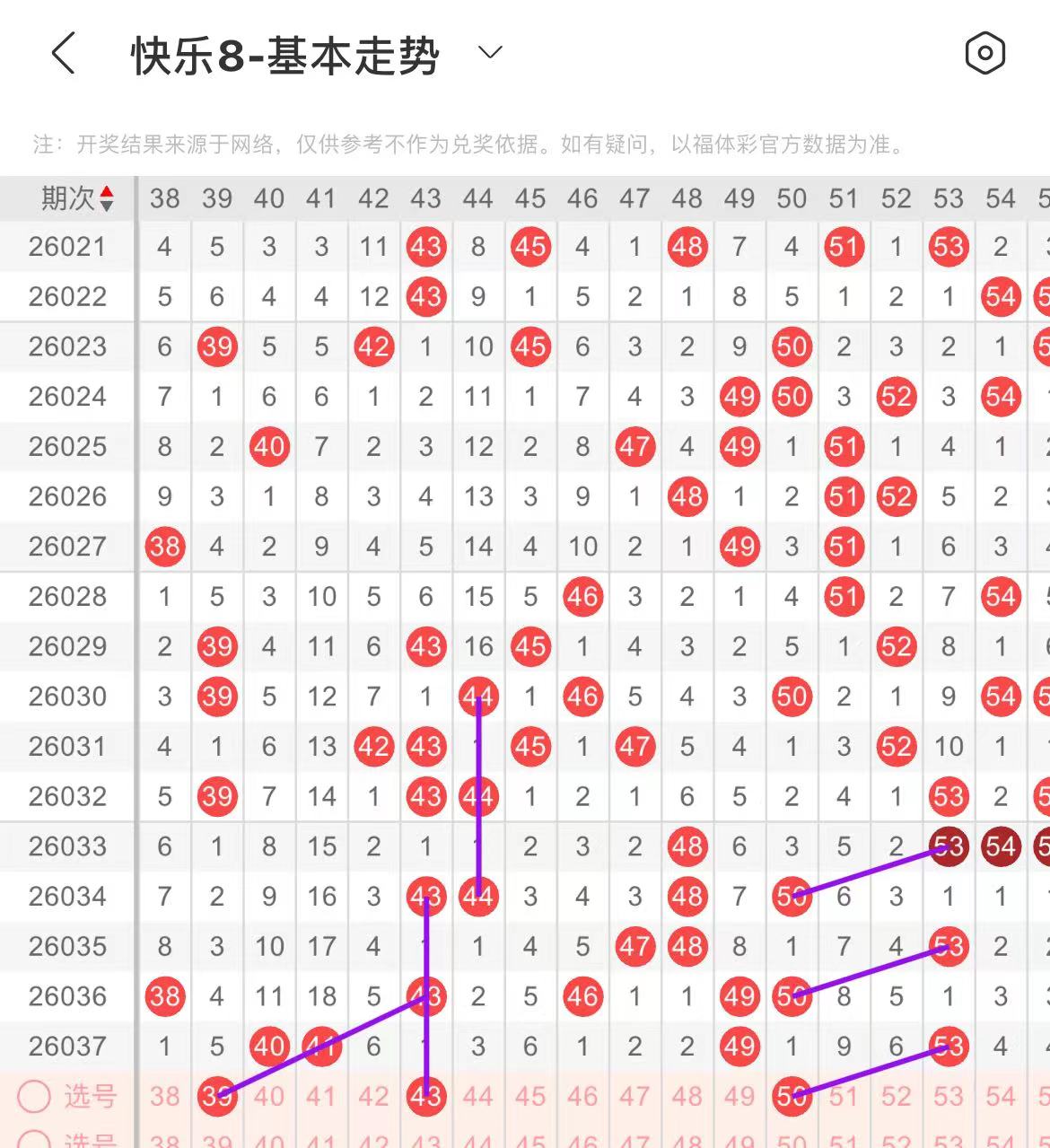 31-40区:本区间上期开出了两个号码,从号码走势图上看,本期继续关注前半区号码回补,出号个数在两三个号码左右。有出号走势的号码有33号,斜连出号走势,防32.33同出,39号,斜连出号走势。