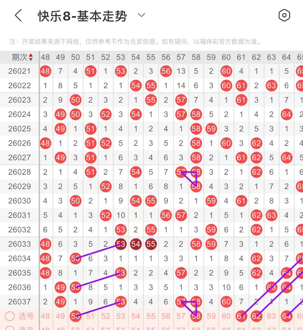 51-60区:本区间上期开出了四个号码,从号码走势图上看,本期可参考的号码走势甚少,在选号上需谨慎,有出号走势的号码有58号,走重,形成一个小三角走势形态,组合号码可考虑54.58/55.58.