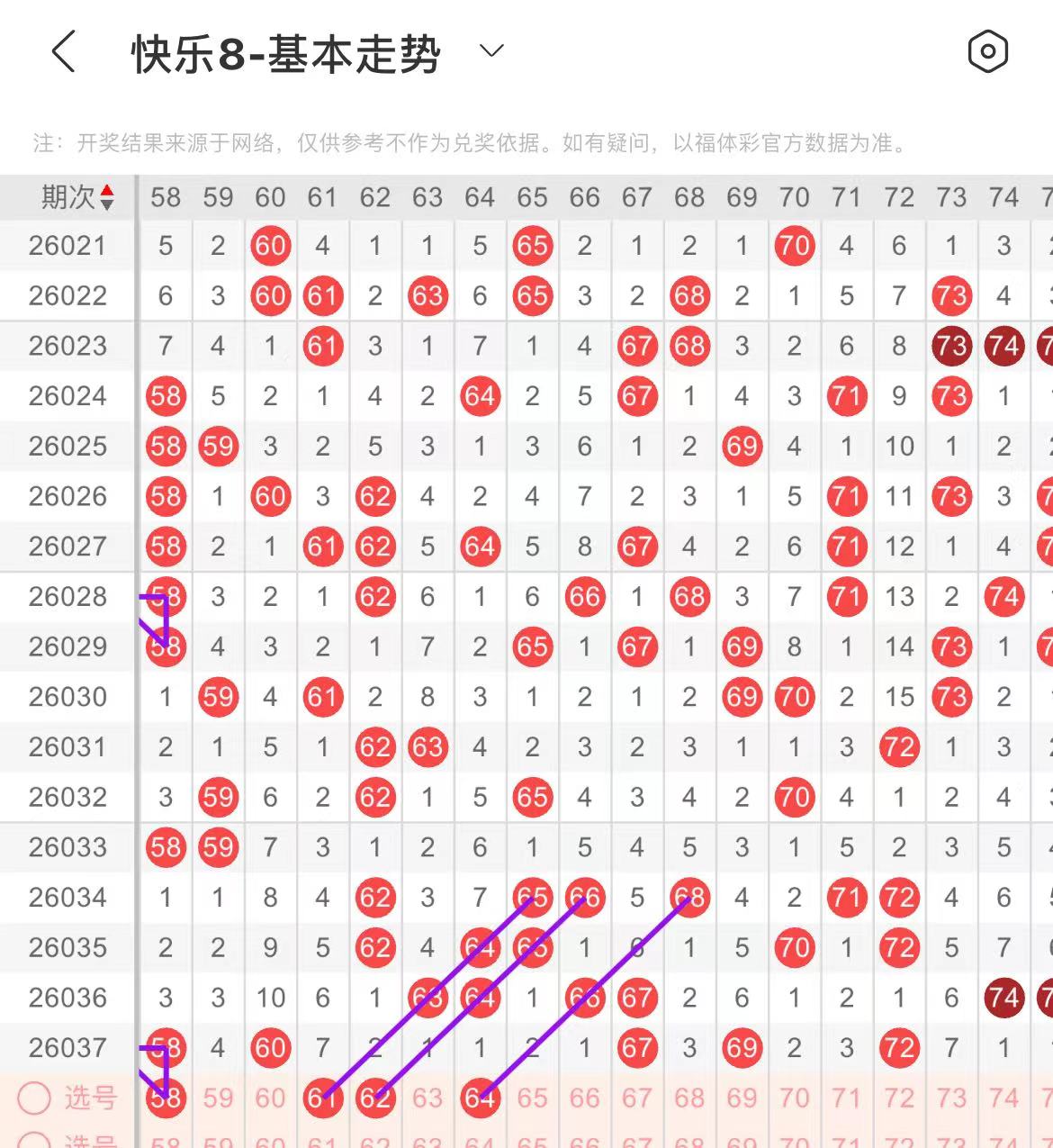 61-70区:本区间上期开出了两个号码,从号码走势图上看,本期重点关注前半区号码回补,出号个数在两个号码左右,有出号走势的号码有61.62号,形态回补,有同出的可能,64号,斜连出号走势。