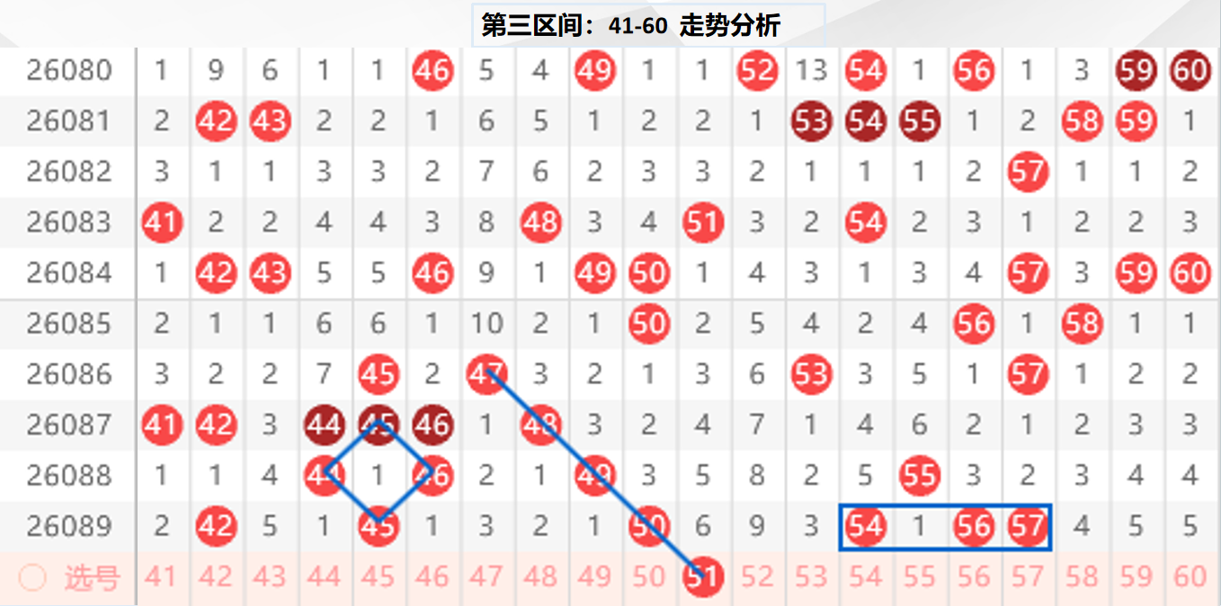 三区分析:【41-60】(走势图标注号码非小黄车大底,请谨慎参考,具体思路将在直播间分享讨论)