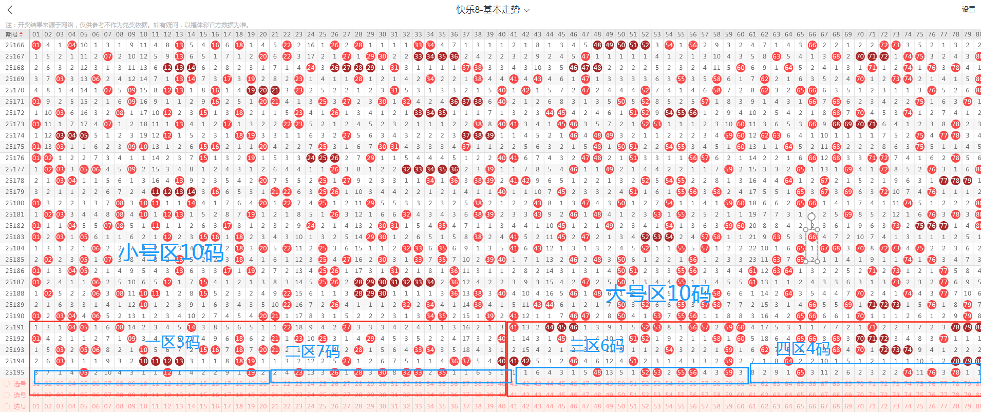 上图是快乐八2025195期区间走势图,从图中看到小号区(1-40)开出10个出奖号码,从开出数量上看与上期开出数量有所减少,热度降温,从小号区近10期出号情况看,整体小号区前区近期偏温趋势;大号区(41-80)本期开出了10个出奖号码,从近期出奖号码个数看属于偏温态势,下期快乐八20250196期大号区号码大概率热度反弹,大小区间主看大区号码热度反弹,大小比具体区间比可参考11:9,防10:10的比例;再从细分区间来判断,按走势图四分区分成四个区间,一区(1-20)开出来的号码有3个;二区(21-40)开出来的号码有7个;三区(41-60)开出来的号码有6个;四区(61-80)开出来的号码有4个;数据上看本期出奖号码集中分布在二、三区。从号码落位区间形态上看,快乐八20250196期主看二、三区热度延续的态势,出奖号码几率较大,需要密切关注。