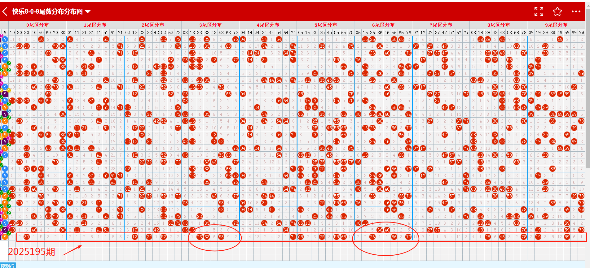 上图是快乐八2025195期的尾码走势图,从图中看0尾到9尾出号个数依次是:0尾号码区开出1个;1尾号码区开出0个;2尾号码区开出3个;3尾号码区开出3个;4尾号码区开出1个;5尾号码区开出4个;6尾号码区开出3个;7尾号码区开出0个;8尾号码区开出3个;9尾号码区开出2个;再看小尾号码(0尾-4尾)区有8码,大尾号有12码;数据比对统计后可以看到5尾出号数量最多,开出了4个中奖号码。本期1、7尾出现断区!由走势比对推断20250196期重点需要关注2、6尾区号码下号热度和增加的概率较大。