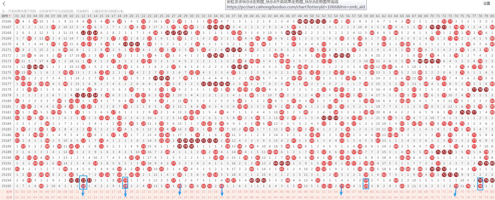 从2025196期重码走势图上看,画蓝色方框图标的是开出来的重码,开出了4个(蓝色方块标示的),重码数量与上期相同;主要分布位置集中在一、四区域下号。从重码图上看,近5期重码下号数量有转暖的趋势。但近期重码下号数量比对,发现在2-10个号码之间均衡下号,所以本期判断重码延续概率极大,本期推断可以参考6个左右(蓝色箭头标示的);建议多加关注(12、19、28、35、55、74);