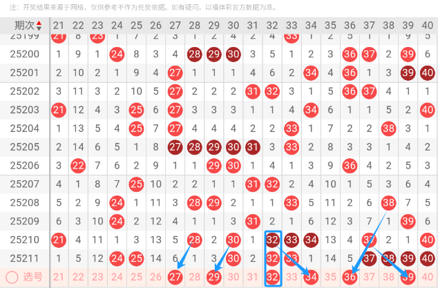 上期当前区段开出9个号码球,再结合前5期出号情况来看当前区段落号率在上升,因此判断本期当前区段出号可能在5个以下,我们再来看下边码,209期没有开出边码号,210期开出30.32.40边码号,211期开出32.33.38.39边码号,跟据近几期来看 ,基本每期都会开出1到2个边码号,因此判断本期当前区段可能存在1个以上边码号。再来看看重叠号,最近10期都有重叠号码开出。本区段建议保留1到2个号码作为重叠号。接下来看当前区段连号,最近10期基本都有出现连号,上期本区段开出32.33.37.38.39.40连号,本期建议关注27-34之间可能开出连号。本区段重点关注遗漏数据0-3之间号码。