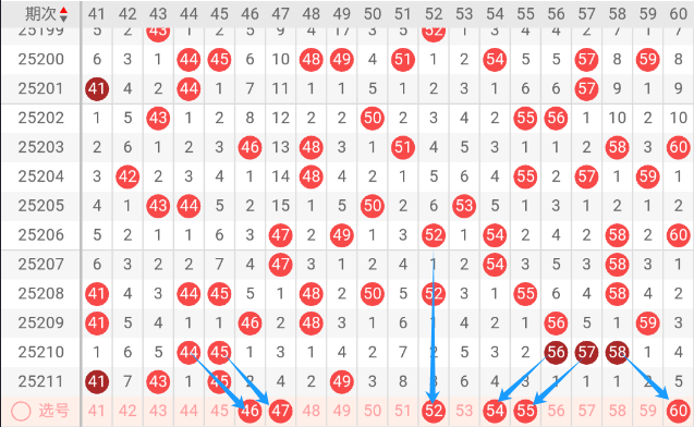 上期当前区段开出4个号码球,再结合前5期出号情况来看当前区段落号率在下降,因此判断本期当前区段出号可能在5个以下,我们再来看下边码,209期开出46.56.59边码号,210期开出45.57.58边码号,211期开出43边码号,跟据近几期来看 ,基本每期都会开出1到2个边码号,因此判断本期当前区段可能存在1个以上边码号。再来看看重叠号,最近10期都有重叠号码开出。本区段建议保留1到2个号码作为重叠号。接下来看当前区段连号,最近10期基本都有出现连号,上期本区段没有开出连号,本期建议关注52-55之间可能开出连号。本区段重点关注遗漏数据2-4之间号码。