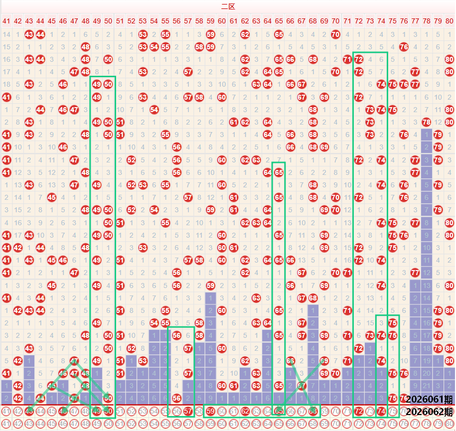 如图所示:在本期大数区的选号中注意在上期的走势中三区间开出了5枚中奖号码,回调至均值水平,4字头的号码依旧保持着较为强势的走势,上期开出了44 47 50的同路三码走势,本期注意43 46 49的同步向前延续走势的多码走势,以及要注意44 47 50的重号走势,建议考虑三选一,5字头在上期的断号回补中,仅开出了一枚中奖号码,50至56小区段依旧保持着空位走势,在上期回补56的位置向后考虑57 58 59的位置建议考虑一码延续走势,建议再57 59考虑二选一,四区间上期开出了2枚中奖号码,出现了断6字头的号码,7字头的号码为遗漏一期的二连走势,本期注意75 76的位置向前延续72 74或者是73 71的单项形态的双码走势,在6字头的号码断号回补中,建议考虑同路的3-4码单项形态的多码走势,个人较为看好68 65 62的同路三码走势,如果考虑5字头尾部位置的59号,则可考虑衔接走势。