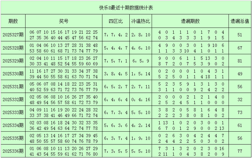一、快乐8第2025337期奖号分析(定义:遗漏0-2期号码为热码,遗漏3-6期号码为温码,遗漏7期及7期以上号码为冷码,重码为上期开出奖号,邻码为上期没有出现,但与上期奖号差值为1的号码,例如上期开出奖号04,没有出现号码03和05,则本期03和05都为邻码,其它则为孤码。