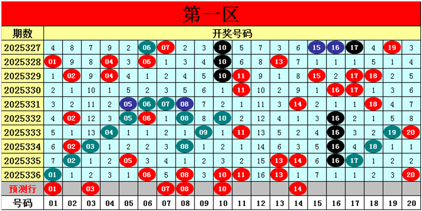 目前第一区包含14个热码:重码7个01、06、08、10、11、13、20,邻码3个02、05、14,孤码4个03、16、17、18;包含4个温码:邻码3个07、09、19,孤码1个04;包含2个冷码:邻码1个12,孤码1个15;号码冷温热个数比为2:4:14,重号、邻码、孤码个数比为7:7:6。