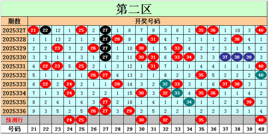 目前第二区包含11个热码:重码3个26、27、29,邻码1个30,孤码7个24、32、33、34、35、36、39;包含8个温码:邻码3个25、28、40,孤码5个22、23、31、37、38;包含1个冷码:邻码1个21,孤码0个;号码冷温热个数比为1:8:11,重号、邻码、孤码个数比为3:5:12。