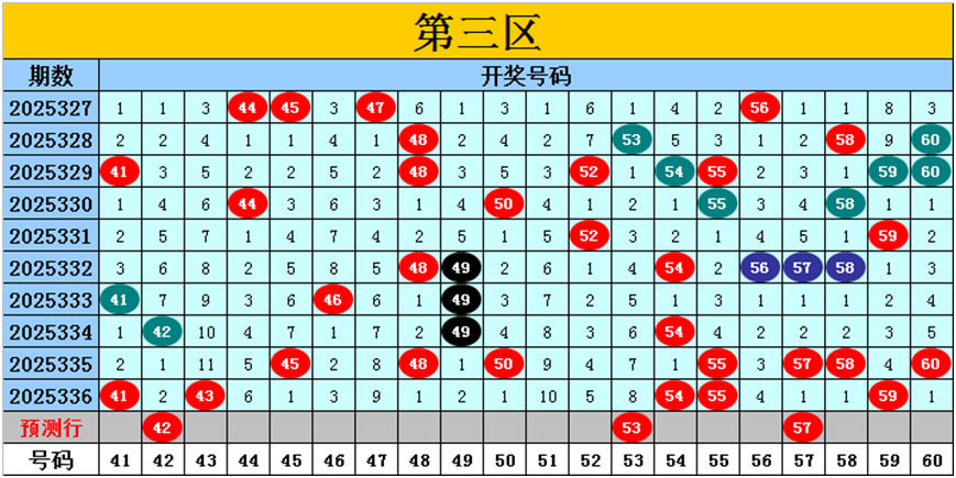 目前第三区包含13个热码:重码5个41、43、54、55、59,邻码3个42、58、60,孤码5个45、48、49、50、57;包含4个温码:邻码2个44、56,孤码2个46、52;包含3个冷码:邻码1个53,孤码2个47、51;号码冷温热个数比为3:4:13,重号、邻码、孤码个数比为5:6:9。
