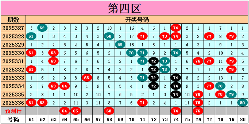 目前第四区包含12个热码:重码5个61、62、71、76、80,邻码4个63、72、77、79,孤码3个64、74、78;包含3个温码:邻码1个70,孤码2个66、73;包含5个冷码:邻码1个75,孤码4个65、67、68、69;号码冷温热个数比为5:3:12,重号、邻码、孤码个数比为5:6:9。