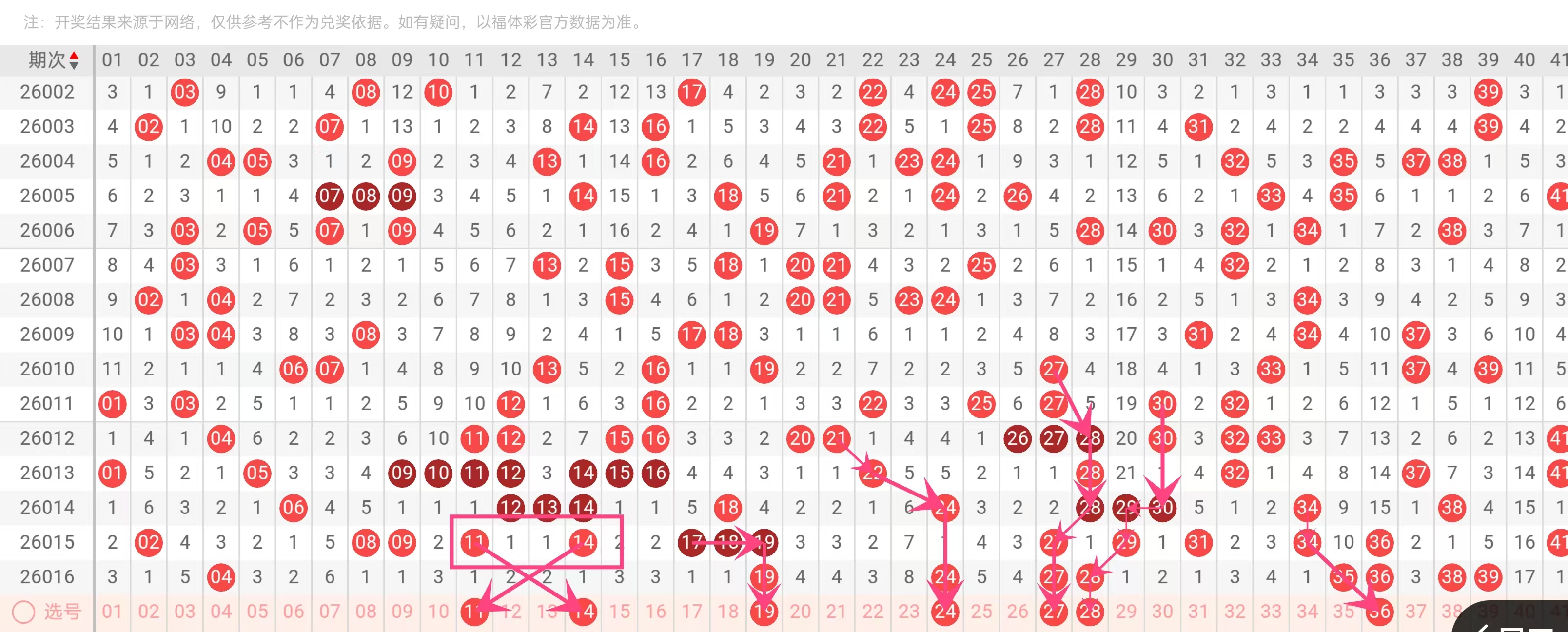 理由:28同样出现4次,在2026012、2026013、2026014、2026016期均有开出,稳定性高。28是偶数,常在连号组合中出现(如与27、29搭配),近期连号现象频发,28可能带动连号趋势,成为胆码。