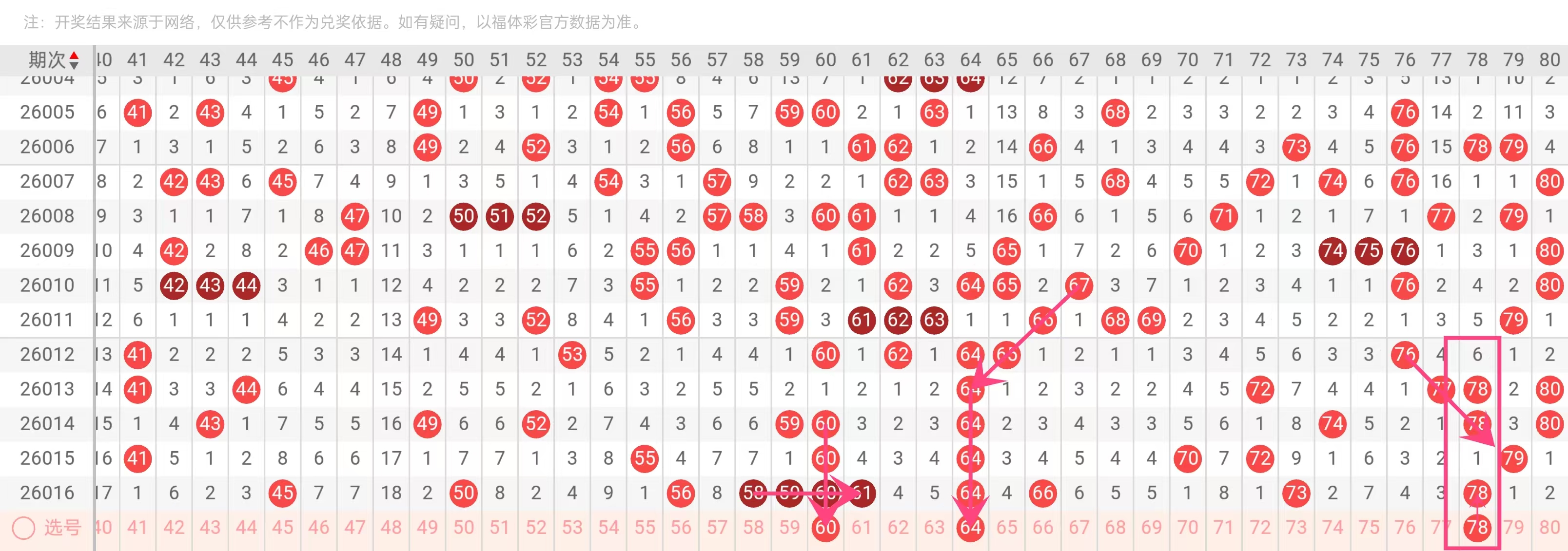 理由:60在近5期出现4次,是活跃热号之一。从大小分布看,60属大号区间,近期大号出号稳健。60与64多期同期出现,呈现协同效应,且其尾数0在近期尾数分析中有所回暖,值得作为胆码关注。