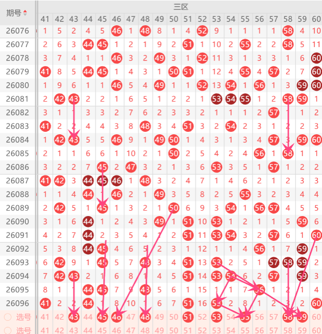 而三区的打底号是43.45.46.48.51.53.54.55.56.58.59中参考3-4码开出机会,