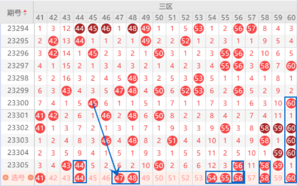 本期的41号数字我们关注一下就行了,做胆码风险还是有点大的。上期开出了连号43 44号数字,本期我们要注意走重的情况。本期的42 45 48号数字我们要注意落下一个号码的情况,它们都是属于2路号码,遗漏2期了,本期有机会出一个号码的,我们重点关注一下45 48的出号情况就行。本期的54号数字是属于遗漏12期的号码,本期遗漏12期的号码有三个,是该出一个号码了。上期开出了连号空一带号56 58 59号数字,本期我们要注意出重的情况。