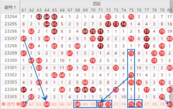 本期的61号数字我们防守一下,有可能会出现回首掏的情况。本期的64号数字是属于斜四连号码,我们要注意一下。三连号68 69 70号数字我们要注意一下落一个号码的情况,重点关注一下68 69号数字的出号情况。本期的71号数字我们关注一下,上期直播的时候就说了,本期出号概率要大一点。本期的75号数字我们要注意一下,属于空二对称号码。出号机会还是有的。本期的80号数字关注一下,做防守一下就行了。