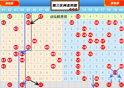 该区间近5期内开出个数比为5:5:5:2:3,观察发现还是有继续走冷趋势,所以本期我们在该区间要慎重选择。44号是属于冷号回补类,而且上期又开出了33号数字,所以还是有参考价值的。在45到54号数字之间有两个冷号为47 51号,这种断号区间出现两个及以上的冷号时,近期出现的机会还是很大的,所本期我们也是要关注的。58 60号以59为中心的号码在上期没有落号下来,近期这种出号趋势都是在遗漏三期时出现,本期我们就防范于未然吧。