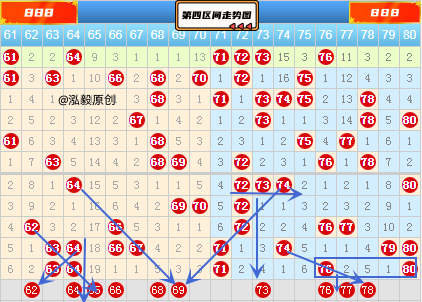 上图中63 64号这种方形类型号码,我们可以参照历史出号趋势,观察历史期数可以发现,在大多数情况下都是会有重号及邻号出现的,所以本期这里是我们主要作战区域了。再来看69号是属于两组断斜连号对称号码,走势太明显了,我们可以把关注对象放在他的邻号上。76 80号这组空三类型中心号78的走势是与74 76号形成三斜连,还和76 77号形成三斜连,从走势来看,也是可以的。73 76 78 80号这个组合在近三期内只开出了76 80号,那么其于号码相信在近期内很快就会出现了,我们要做好打算。好了,本期分析就到这里了。
