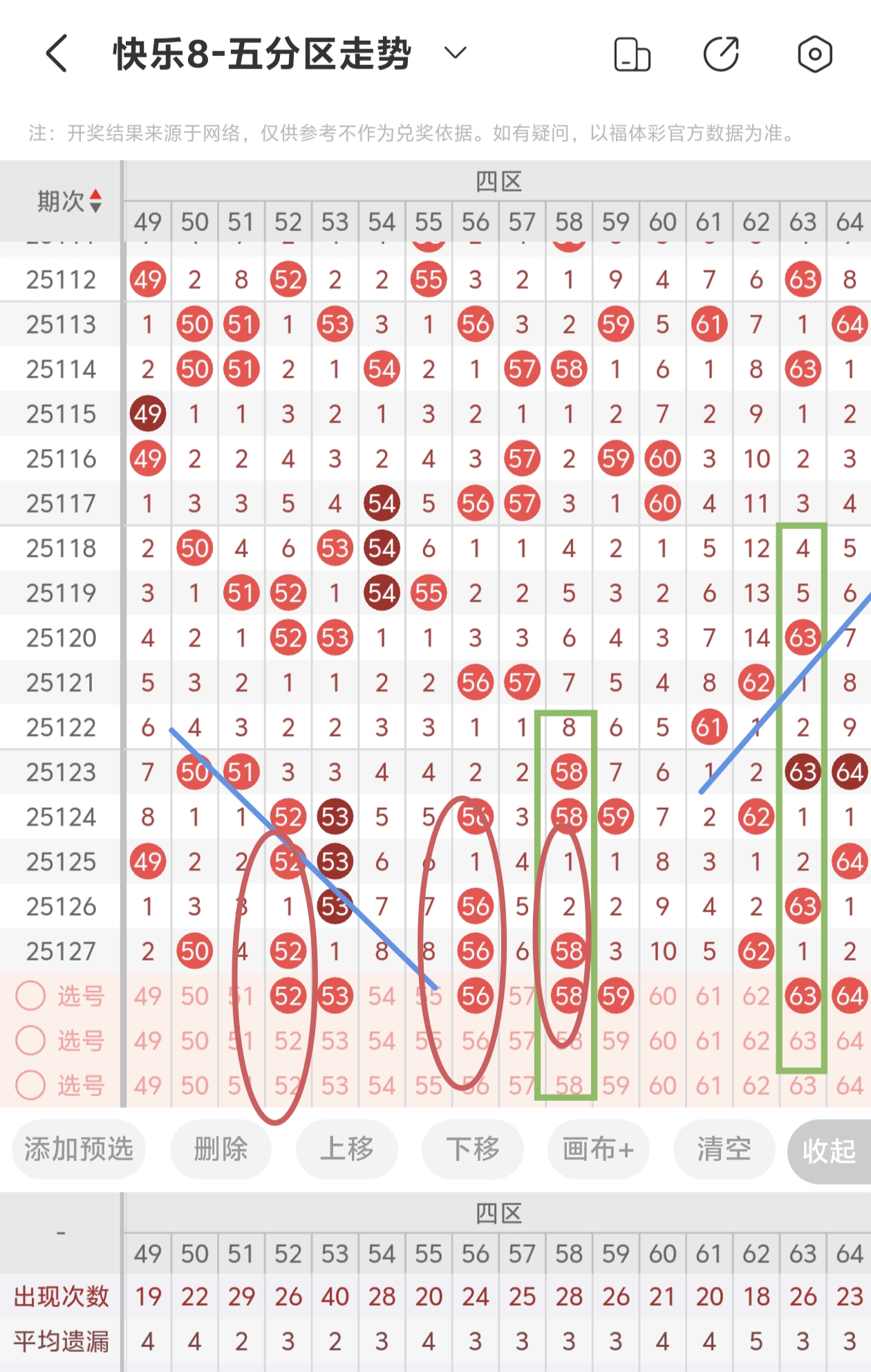 首先,快乐8的走势4区图里在近100期的数据里,根据平均遗漏值在0-3之间的号码中,选出当前遗漏值在0-3之间的热码作为备选号码。则走势4区符合条件的号码分别有:52—53—56—58—59—63—64。